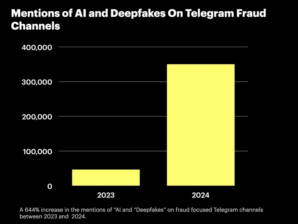 Point Predictive monitored conversations related to AI and deepfakes in fraud channels on Telegram in 2023 and 2024. And the volume of messages grew from 47,000 in 2023 to over 350,000 in 2024 – a more than seven-fold increase.