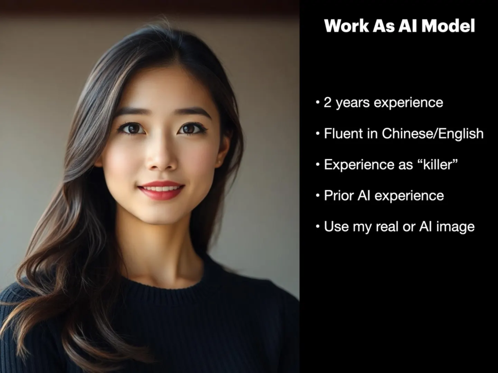 In one ad, a young woman posts pictures of herself with the caption “Work As An AI Model.” She claims to have previously worked for pig butchering compounds(a type of social engineering fraud) as a Killer (a colloquial term used for employees of such scammers) and now she wants to transition to “AI modeling”.